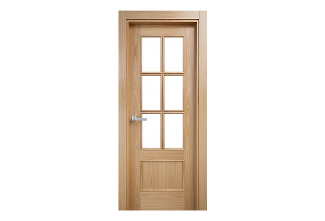 Puerta clásica de interior en madera de roble barnizado con 6 vidrios